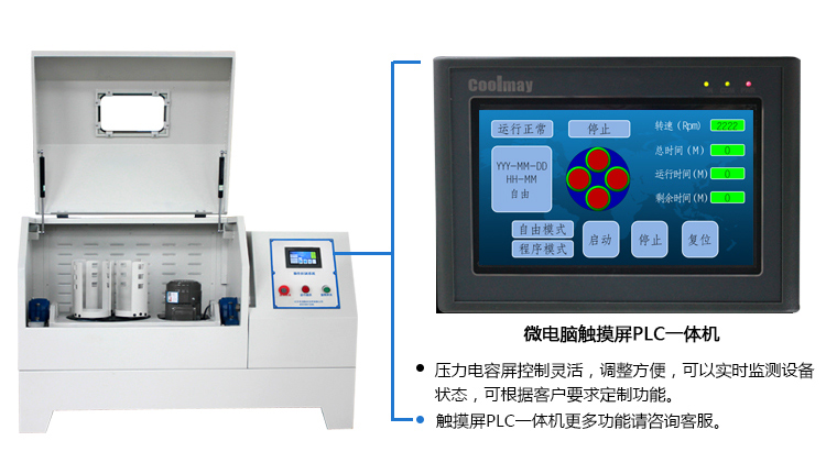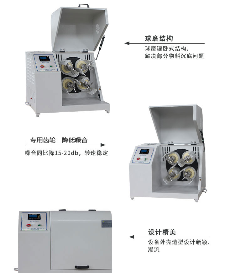设备外壳造型设计新颖、潮流,精益制造,精致、精巧;机加零件材料严格热处理工序,采用数控加工工艺,传动齿轮选用特殊材料精密齿轮,确保设备高速运行时平稳、安全、安静;磨罐压紧装置操作便捷、安全可靠,采用微电脑触控屏,操作方便,界面简单直观,可实现正反转交替控制,有定时和断电记忆功能 。