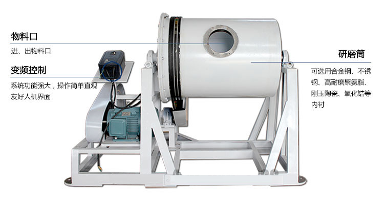 轻型滚筒式球磨机工作时,筒体内的研磨介质和物料一起随筒体转动提升到一定高度,由于重力作用而脱离筒壁沿抛物线下落,研磨介质和物料在研磨罐内高速翻滚,对物料产生强力剪切、冲击、碾压达到粉碎、研磨、分散、乳化物料的目的。