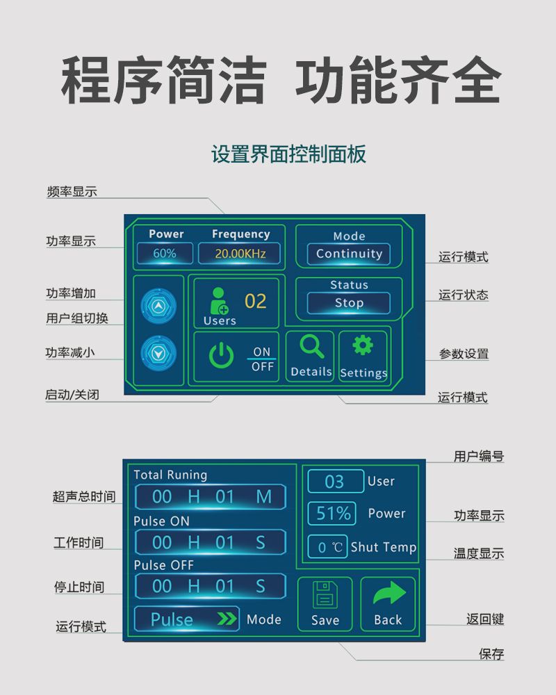■ 运行模式设定有三种:连续使用、脉冲、定时连续超声,满足多种材料处理。